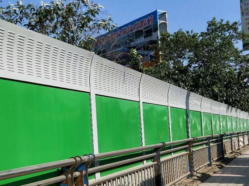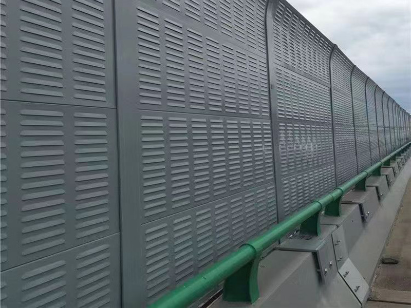 橋梁聲屏障是以吸聲材料為芯材,采用彩鋼夾芯板聲學構件組裝成的吸、隔聲屏障。彩鋼聲屏障吸聲型聲學構件可加工成百頁窗式、穿孔式、微穿孔式和開槽孔式等若干種吸、隔聲型聲學單元。百葉窗和穿孔的吸聲彩鋼復合板中、高頻隔聲性能較好,不開槽孔的彩鋼復合板聲學構件對中、低頻隔聲性能較好。因此可根據噪聲特點選用不同結構形式的聲屏障。